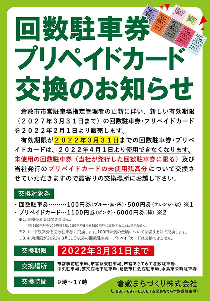 倉敷市市営駐車場指定管理者の更新に伴い、新しい有効期限(2027年3月31日まで)の回数駐車券・プリペイドカードを 2022年2月1日より販売 します。