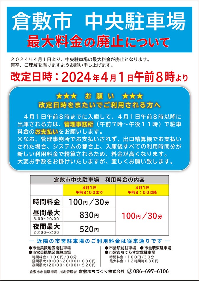 平素より倉敷市市営駐車場をご利用いただき誠にありがとうございます。下記のとおり、2024年4月1日より中央駐車場の最大料金が廃止となります。何卒、ご理解を賜りますようお願い申し上げます。