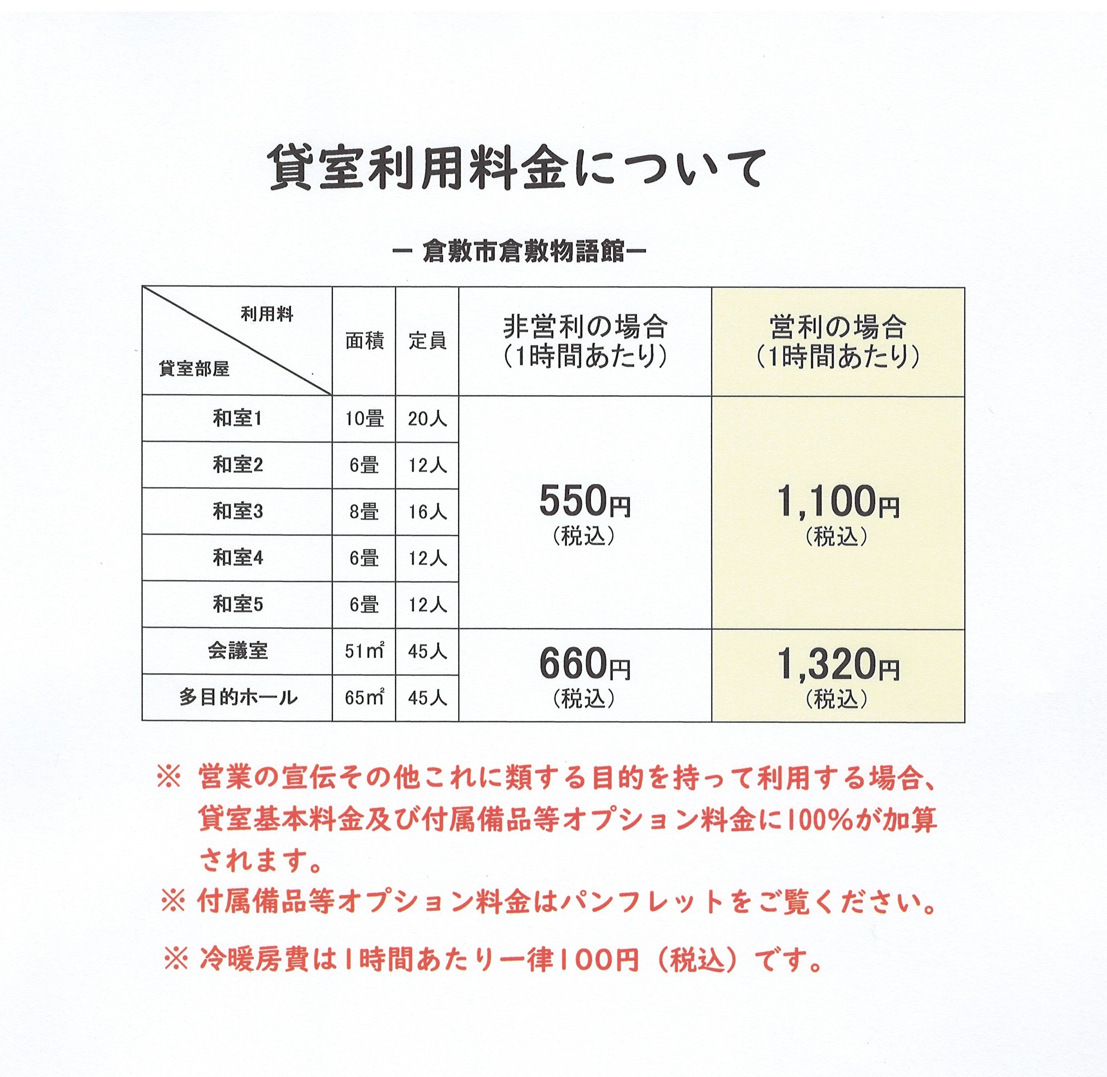 - 営業の宣伝その他これに類する目的を持って利用する場合、貸室基本料金及び付属備品等オプション料金に100%が加算されます。(冷暖房費は除く。)